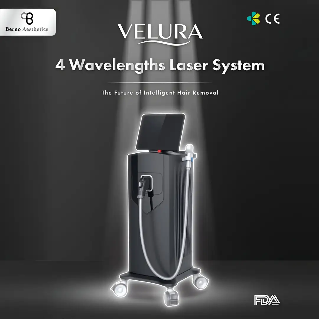 Velura adalah teknologi hair removal permanen yang menggabungkan empat panjang gelombang laser (755nm, 808nm, 940nm, dan 1064nm) dalam satu alat. Berbeda dengan laser konvensional yang hanya menggunakan satu jenis gelombang, Velura mampu menembus berbagai kedalaman folikel rambut secara sekaligus. Hal ini membuat proses penghilangan bulu lebih efektif, cepat, dan aman untuk semua jenis warna kulit.